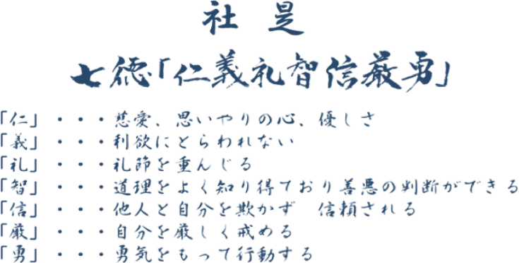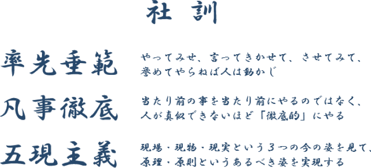 「社員の幸福を追求する」の信条にもとづく活動により顧客満足を実現する。 社員の物心両面の充実を図ると共に、社会貢献に寄与する。 日々精進し、技術の向上に挑むと共に、建設業の進歩発展に貢献する。 人命尊重に立脚し、安全第一で業務にあたる。